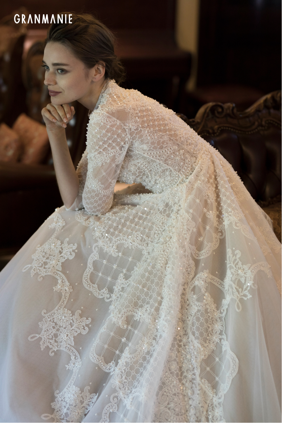 王室の美学と現代的な感性が融合した、エルサ・アトリエのウエディングドレス。デザイナー自身がレースの柄を描き、スワロフスキークリスタルとパールを丁寧に手刺繍した唯一無二の装飾が、光を纏うように花嫁を輝かせます。クラシカルな佇まいに映える洗練されたシルエットが、特別な日を格別の記憶へと導きます。