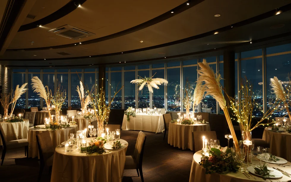 JR岐阜駅直結の高層レストランウエディング会場。6〜80名まで対応し、地上160mから岐阜市街を一望できる眺望が魅力です。