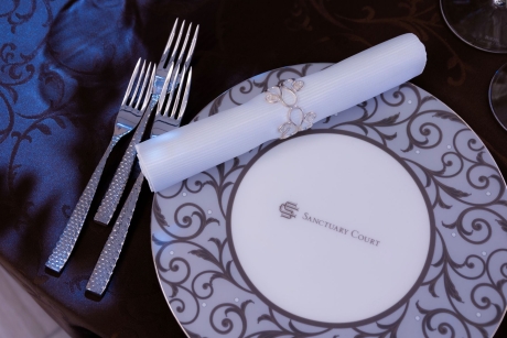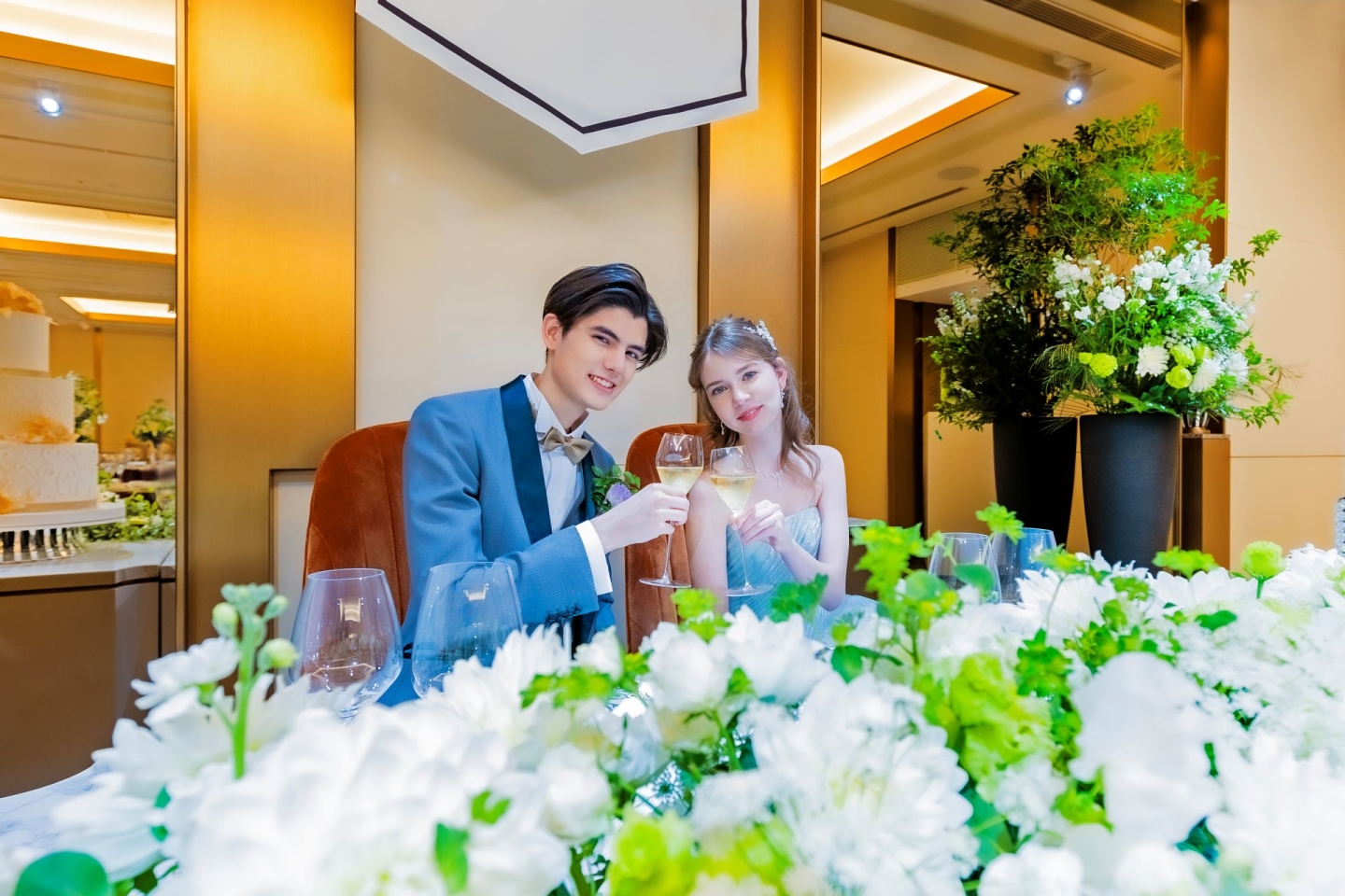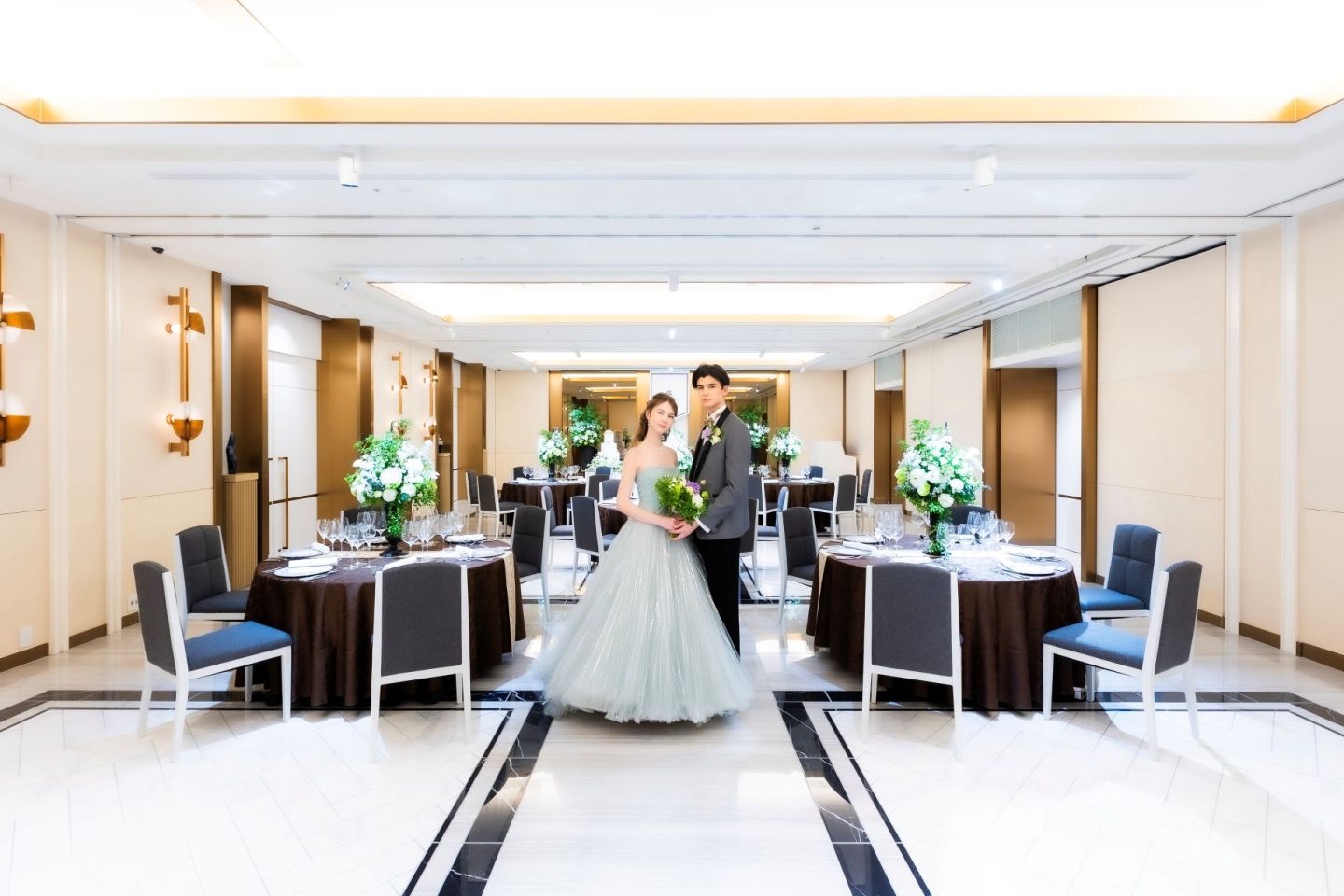気高い白とブロンズを基調としたラグジュアリーな迎賓空間で行うパーティー。さまざまなテーブルコーディネートをはじめ料理・会場の装花・ロマンチックな演出など細部に至るまでおふたりの思いに応えてくれます。